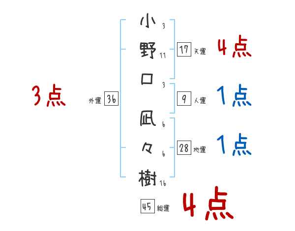 外運![]() | 小野口凪々樹さんの外運は36画の3つ星!先見性が豊かです。多少神経質で苦労することも。 生活面を象徴する運勢です。外部から受ける影響力を表し、結婚運、家庭運や職場、環境への順応性を表します。 |