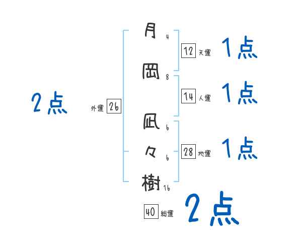 外運![]() | 月岡凪々樹さんの外運は26画の2つ星!波瀾万丈かも。信頼できる人を大事にしましょう。 生活面を象徴する運勢です。外部から受ける影響力を表し、結婚運、家庭運や職場、環境への順応性を表します。 |