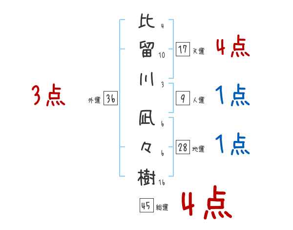 外運![]() | 比留川凪々樹さんの外運は36画の3つ星!先見性が豊かです。多少神経質で苦労することも。 生活面を象徴する運勢です。外部から受ける影響力を表し、結婚運、家庭運や職場、環境への順応性を表します。 |
