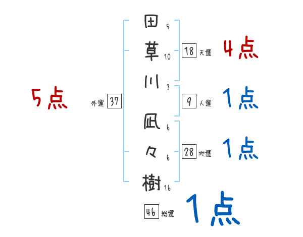 総運![]() | 田草川凪々樹さんの総運は46画の1つ星!迷走することが多く苦労するかも。目先のことにとらわれないように。 あなたの人生を表す1番重要な運勢です。生涯を通じて影響する総合運となり、主に50歳以降の晩年期に影響を及ぼします。 |