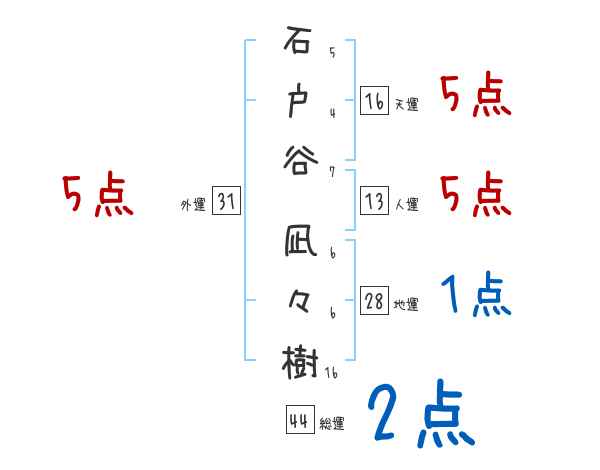 天運![]() | 石戸谷凪々樹さんの天運は16画の5つ星!人望が厚く大きく発展する。逆転成功が見える。 家系が持つ宿命的な運勢を表します。祖先から受け継いだ苗字ですので自分の力が及びません。家柄を象徴します。 |
