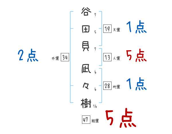 人運![]() | 谷田貝凪々樹さんの人運は13画の5つ星!才能に恵まれ人気がある。名声を手に入れる。円満な人生。 性格や才能などを表す2番目に重要な運勢です。人間関係や協調性、社会的な成功に影響します。主に20歳から50歳ぐらいまでの中年期の運勢を表します。 |