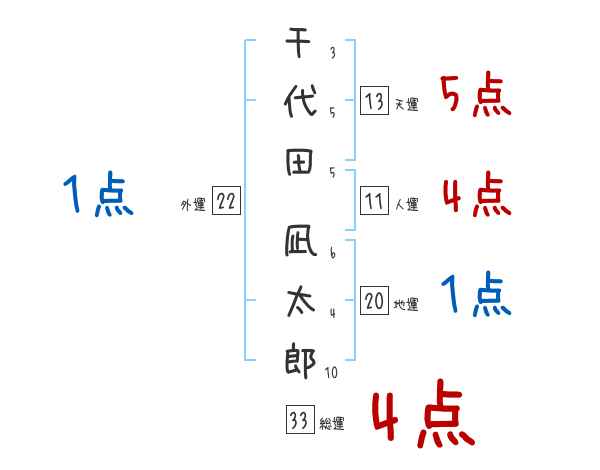 外運![]() | 千代田凪太郎さんの外運は22画の1つ星!努力することが苦手ないっぽう手先が器用。芸術性にも優れる。 生活面を象徴する運勢です。外部から受ける影響力を表し、結婚運、家庭運や職場、環境への順応性を表します。 |