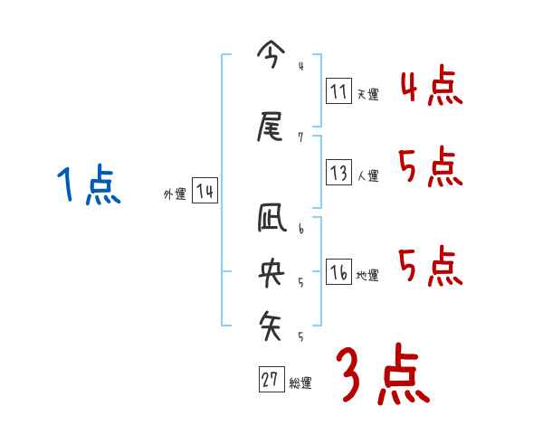 外運![]() | 今尾凪央矢さんの外運は14画の1つ星!人に対して優しいがストレスを溜め込みがち。人間関係のトラブルを避けるよう気をつけましょう。 生活面を象徴する運勢です。外部から受ける影響力を表し、結婚運、家庭運や職場、環境への順応性を表します。 |