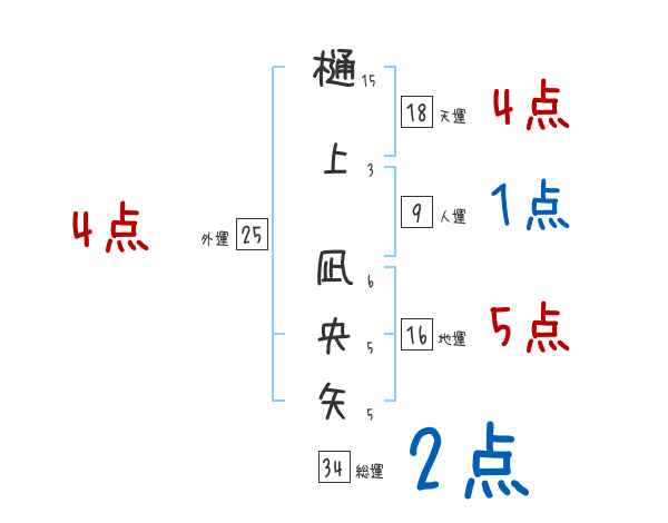 天運![]() | 樋上凪央矢さんの天運は18画の4つ星!情熱的で剛気。忍耐力があり信頼される。 家系が持つ宿命的な運勢を表します。祖先から受け継いだ苗字ですので自分の力が及びません。家柄を象徴します。 |