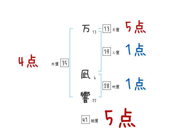 外運![]() | 万凪響さんの外運は35画の4つ星!温厚な性格で感受性が高い。穏和な性格で人望が厚い。 生活面を象徴する運勢です。外部から受ける影響力を表し、結婚運、家庭運や職場、環境への順応性を表します。 |