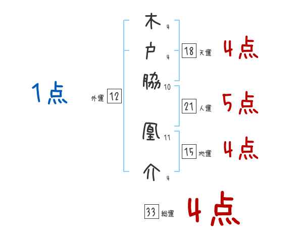 天運![]() | 木戸脇凰介さんの天運は18画の4つ星!情熱的で剛気。忍耐力があり信頼される。 家系が持つ宿命的な運勢を表します。祖先から受け継いだ苗字ですので自分の力が及びません。家柄を象徴します。 |