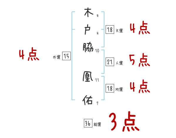 天運![]() | 木戸脇凰佑さんの天運は18画の4つ星!情熱的で剛気。忍耐力があり信頼される。 家系が持つ宿命的な運勢を表します。祖先から受け継いだ苗字ですので自分の力が及びません。家柄を象徴します。 |
