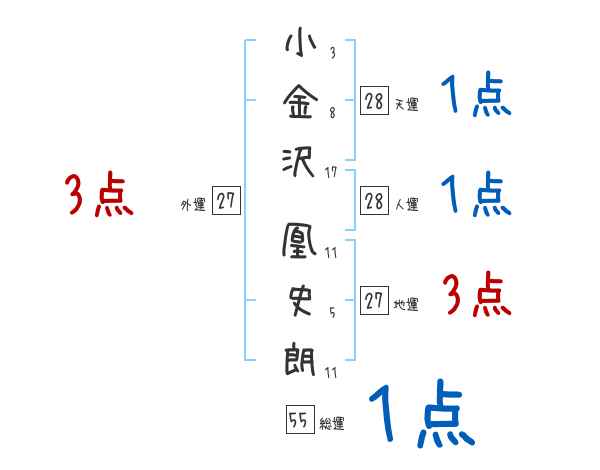 天運![]() | 小金沢凰史朗さんの天運は28画の1つ星!家庭環境に注意。スポーツで活躍できる能力があるかも。 家系が持つ宿命的な運勢を表します。祖先から受け継いだ苗字ですので自分の力が及びません。家柄を象徴します。 |