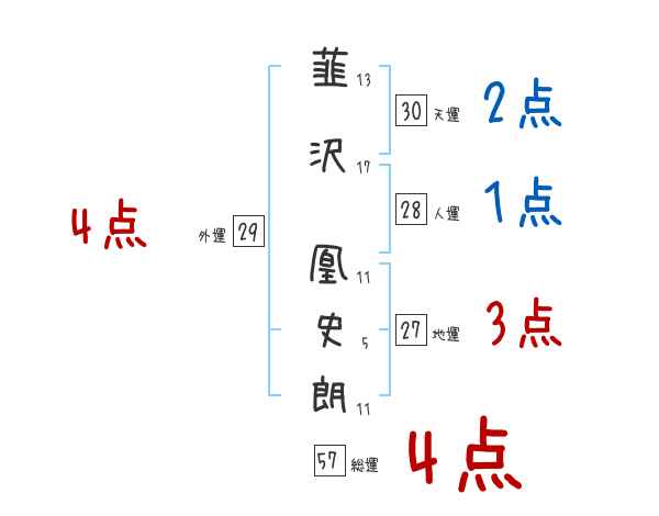 外運![]() | 韮沢凰史朗さんの外運は29画の4つ星!完全主義で才能がある。厳格な心の持ち主。 生活面を象徴する運勢です。外部から受ける影響力を表し、結婚運、家庭運や職場、環境への順応性を表します。 |
