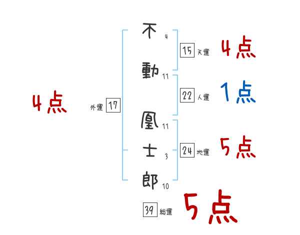 総運![]() | 不動凰士郎さんの総運は39画の5つ星!社交性に優れ人望が厚い。人の上に立ち成功する。 あなたの人生を表す1番重要な運勢です。生涯を通じて影響する総合運となり、主に50歳以降の晩年期に影響を及ぼします。 |