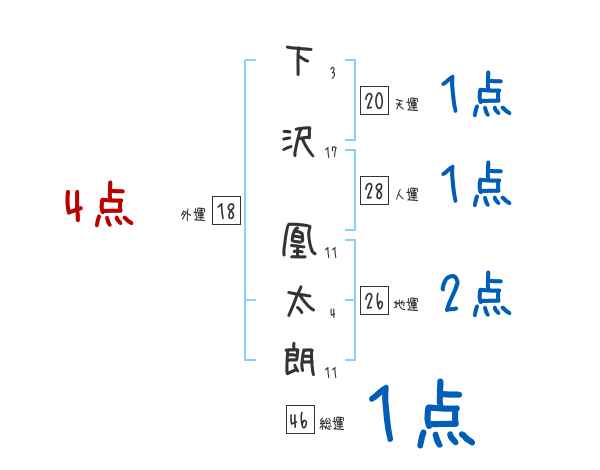人運![]() | 下沢凰太朗さんの人運は28画の1つ星!家庭環境に注意。スポーツで活躍できる能力があるかも。 性格や才能などを表す2番目に重要な運勢です。人間関係や協調性、社会的な成功に影響します。主に20歳から50歳ぐらいまでの中年期の運勢を表します。 |