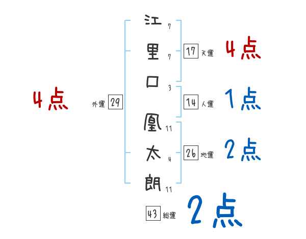 総運![]() | 江里口凰太朗さんの総運は43画の2つ星!頑固な性格で独立心が強いかも。やや非現実的で浪費に注意しましょう。 あなたの人生を表す1番重要な運勢です。生涯を通じて影響する総合運となり、主に50歳以降の晩年期に影響を及ぼします。 |