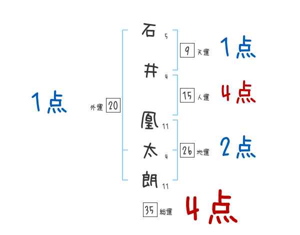 天運![]() | 石井凰太朗さんの天運は9画の1つ星!消極的で才能を発揮することが苦手なことも。周りの意見に耳を傾けましょう。 家系が持つ宿命的な運勢を表します。祖先から受け継いだ苗字ですので自分の力が及びません。家柄を象徴します。 |