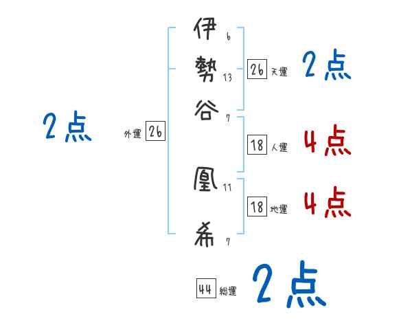 天運![]() | 伊勢谷凰希さんの天運は26画の2つ星!波瀾万丈かも。信頼できる人を大事にしましょう。 家系が持つ宿命的な運勢を表します。祖先から受け継いだ苗字ですので自分の力が及びません。家柄を象徴します。 |