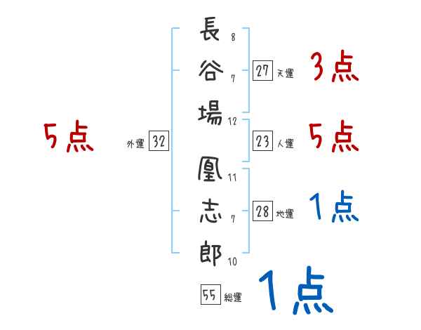 外運![]() | 長谷場凰志郎さんの外運は32画の5つ星!柔軟性があり成功する。チャンスが多く金運が良い。 生活面を象徴する運勢です。外部から受ける影響力を表し、結婚運、家庭運や職場、環境への順応性を表します。 |