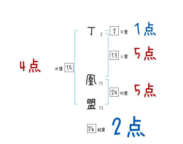 外運![]() | 丁凰盟さんの外運は15画の4つ星!人徳があり出世する。順調に物事を進め円満な人生。 生活面を象徴する運勢です。外部から受ける影響力を表し、結婚運、家庭運や職場、環境への順応性を表します。 |