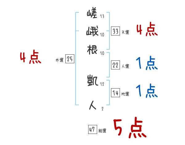 天運![]() | 嵯峨根凱人さんの天運は33画の4つ星!権力志向でプライドが高い。勇気があり運を切り開き成功する。 家系が持つ宿命的な運勢を表します。祖先から受け継いだ苗字ですので自分の力が及びません。家柄を象徴します。 |