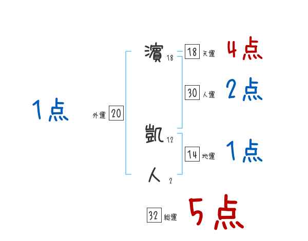 総運![]() | 濵凱人さんの総運は32画の5つ星!柔軟性があり成功する。チャンスが多く金運が良い。 あなたの人生を表す1番重要な運勢です。生涯を通じて影響する総合運となり、主に50歳以降の晩年期に影響を及ぼします。 |