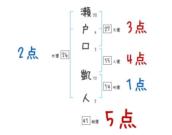 外運![]() | 瀬戸口凱人さんの外運は26画の2つ星!波瀾万丈かも。信頼できる人を大事にしましょう。 生活面を象徴する運勢です。外部から受ける影響力を表し、結婚運、家庭運や職場、環境への順応性を表します。 |