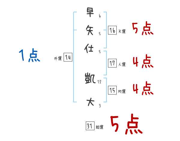 天運![]() | 早矢仕凱大さんの天運は16画の5つ星!人望が厚く大きく発展する。逆転成功が見える。 家系が持つ宿命的な運勢を表します。祖先から受け継いだ苗字ですので自分の力が及びません。家柄を象徴します。 |