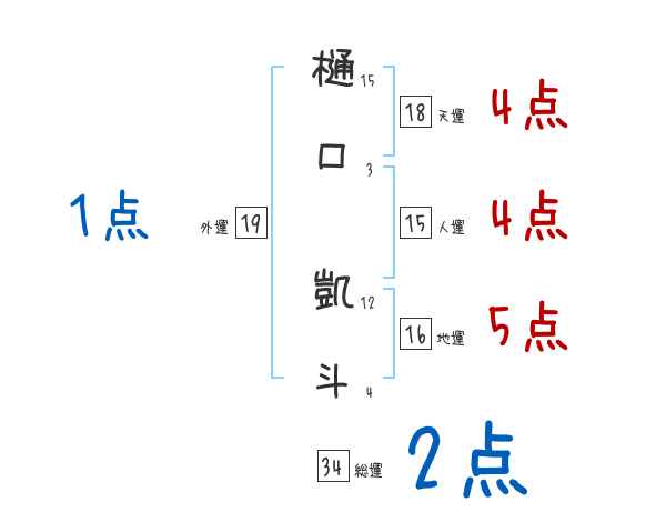 外運![]() | 樋口凱斗さんの外運は19画の1つ星!優れた才能を持ちますが、協調性が足りないことも。周りの人と協力する事を意識しましょう。 生活面を象徴する運勢です。外部から受ける影響力を表し、結婚運、家庭運や職場、環境への順応性を表します。 |