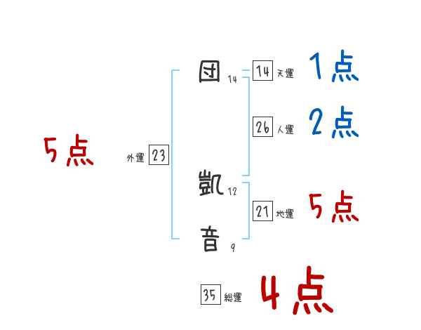 総運![]() | 団凱音さんの総運は35画の4つ星!温厚な性格で感受性が高い。穏和な性格で人望が厚い。 あなたの人生を表す1番重要な運勢です。生涯を通じて影響する総合運となり、主に50歳以降の晩年期に影響を及ぼします。 |