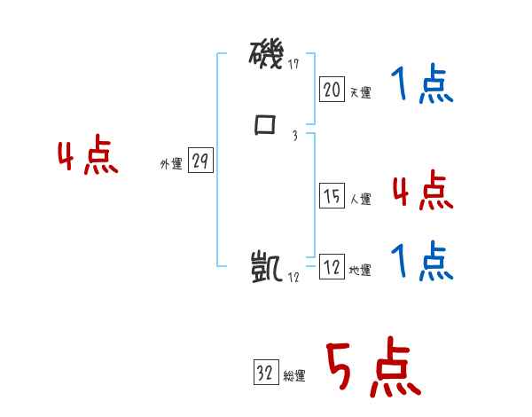 総運![]() | 磯口凱さんの総運は32画の5つ星!柔軟性があり成功する。チャンスが多く金運が良い。 あなたの人生を表す1番重要な運勢です。生涯を通じて影響する総合運となり、主に50歳以降の晩年期に影響を及ぼします。 |