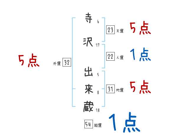 外運![]() | 寺沢出来蔵さんの外運は32画の5つ星!柔軟性があり成功する。チャンスが多く金運が良い。 生活面を象徴する運勢です。外部から受ける影響力を表し、結婚運、家庭運や職場、環境への順応性を表します。 |