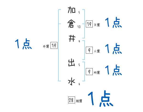 天運![]() | 加倉井出水さんの天運は19画の1つ星!優れた才能を持ちますが、協調性が足りないことも。周りの人と協力する事を意識しましょう。 家系が持つ宿命的な運勢を表します。祖先から受け継いだ苗字ですので自分の力が及びません。家柄を象徴します。 |