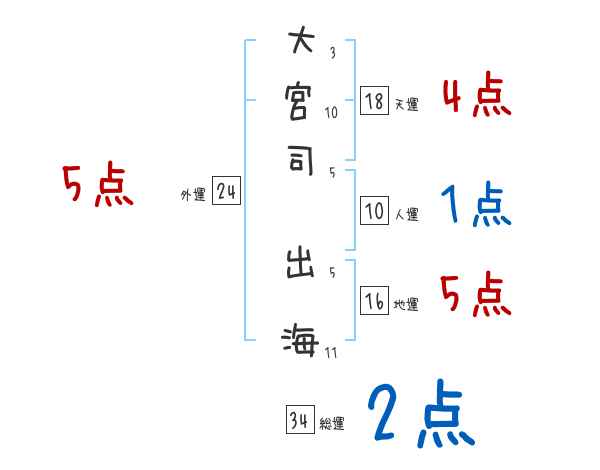外運![]() | 大宮司出海さんの外運は24画の5つ星!家庭運が良く順調な人生。金運にも恵まれる。 生活面を象徴する運勢です。外部から受ける影響力を表し、結婚運、家庭運や職場、環境への順応性を表します。 |
