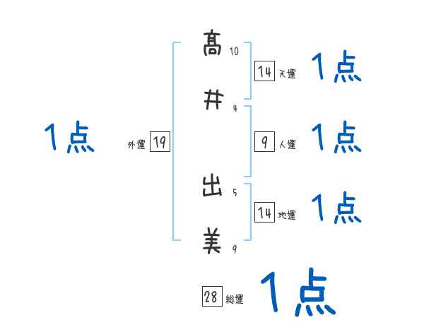 総運![]() | 髙井出美さんの総運は28画の1つ星!家庭環境に注意。スポーツで活躍できる能力があるかも。 あなたの人生を表す1番重要な運勢です。生涯を通じて影響する総合運となり、主に50歳以降の晩年期に影響を及ぼします。 |