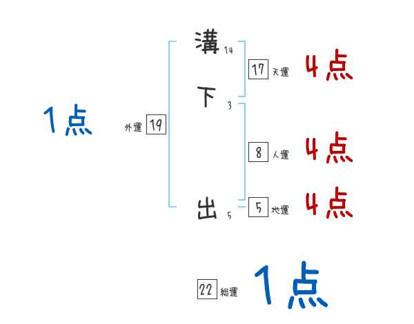 天運![]() | 溝下出さんの天運は17画の4つ星!積極的な行動力。地位を気づき財産を手に入れる。純粋な心と直感力。 家系が持つ宿命的な運勢を表します。祖先から受け継いだ苗字ですので自分の力が及びません。家柄を象徴します。 |
