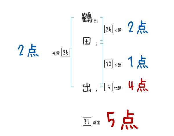 外運![]() | 鶴田出さんの外運は26画の2つ星!波瀾万丈かも。信頼できる人を大事にしましょう。 生活面を象徴する運勢です。外部から受ける影響力を表し、結婚運、家庭運や職場、環境への順応性を表します。 |