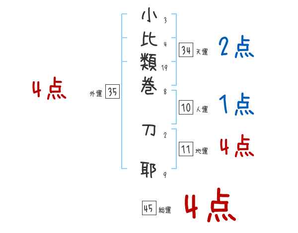 外運![]() | 小比類巻刀耶さんの外運は35画の4つ星!温厚な性格で感受性が高い。穏和な性格で人望が厚い。 生活面を象徴する運勢です。外部から受ける影響力を表し、結婚運、家庭運や職場、環境への順応性を表します。 |