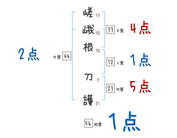 天運![]() | 嵯峨根刀護さんの天運は33画の4つ星!権力志向でプライドが高い。勇気があり運を切り開き成功する。 家系が持つ宿命的な運勢を表します。祖先から受け継いだ苗字ですので自分の力が及びません。家柄を象徴します。 |