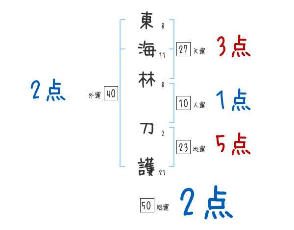 外運![]() | 東海林刀護さんの外運は40画の2つ星!自信過剰で物事に固執するためトラブルに注意。 生活面を象徴する運勢です。外部から受ける影響力を表し、結婚運、家庭運や職場、環境への順応性を表します。 |