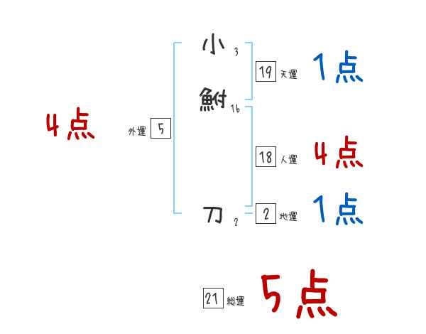 外運![]() | 小鮒刀さんの外運は5画の4つ星!健康で安泰。協調性に優れ、財産に恵まれる。 生活面を象徴する運勢です。外部から受ける影響力を表し、結婚運、家庭運や職場、環境への順応性を表します。 |