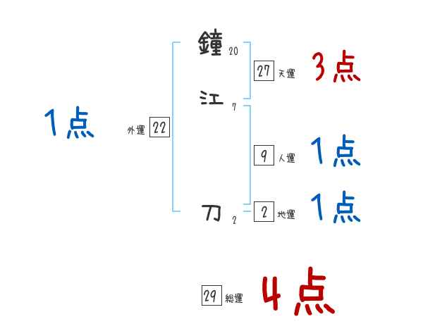 天運![]() | 鐘江刀さんの天運は27画の3つ星!頭脳明晰だが強情で摩擦が多い傾向。孤立に注意。 家系が持つ宿命的な運勢を表します。祖先から受け継いだ苗字ですので自分の力が及びません。家柄を象徴します。 |