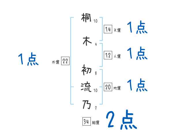 総運![]() | 桐木初流乃さんの総運は34画の2つ星!独創性に優れるが、自尊心が強く災難に注意しましょう。 あなたの人生を表す1番重要な運勢です。生涯を通じて影響する総合運となり、主に50歳以降の晩年期に影響を及ぼします。 |