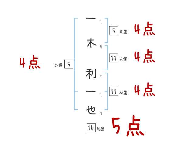 天運![]() | 一木利一也さんの天運は5画の4つ星!健康で安泰。協調性に優れ、財産に恵まれる。 家系が持つ宿命的な運勢を表します。祖先から受け継いだ苗字ですので自分の力が及びません。家柄を象徴します。 |