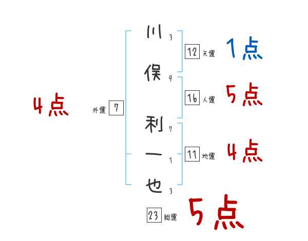 人運![]() | 川俣利一也さんの人運は16画の5つ星!人望が厚く大きく発展する。逆転成功が見える。 性格や才能などを表す2番目に重要な運勢です。人間関係や協調性、社会的な成功に影響します。主に20歳から50歳ぐらいまでの中年期の運勢を表します。 |