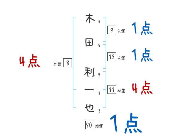天運![]() | 木田利一也さんの天運は9画の1つ星!消極的で才能を発揮することが苦手なことも。周りの意見に耳を傾けましょう。 家系が持つ宿命的な運勢を表します。祖先から受け継いだ苗字ですので自分の力が及びません。家柄を象徴します。 |