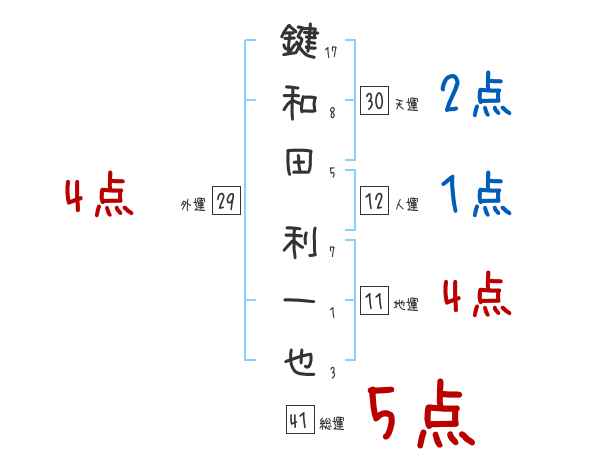 外運![]() | 鍵和田利一也さんの外運は29画の4つ星!完全主義で才能がある。厳格な心の持ち主。 生活面を象徴する運勢です。外部から受ける影響力を表し、結婚運、家庭運や職場、環境への順応性を表します。 |