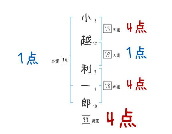 外運![]() | 小越利一郎さんの外運は14画の1つ星!人に対して優しいがストレスを溜め込みがち。人間関係のトラブルを避けるよう気をつけましょう。 生活面を象徴する運勢です。外部から受ける影響力を表し、結婚運、家庭運や職場、環境への順応性を表します。 |