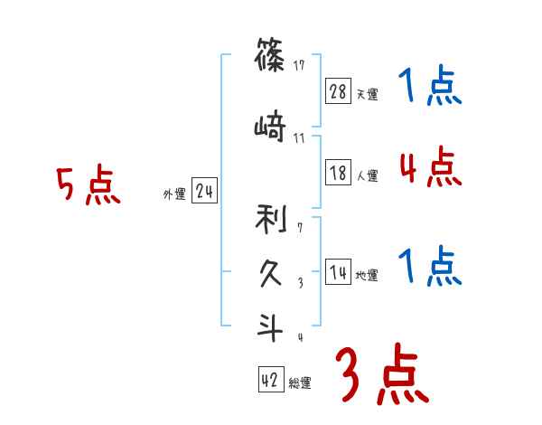 天運![]() | 篠﨑利久斗さんの天運は28画の1つ星!家庭環境に注意。スポーツで活躍できる能力があるかも。 家系が持つ宿命的な運勢を表します。祖先から受け継いだ苗字ですので自分の力が及びません。家柄を象徴します。 |