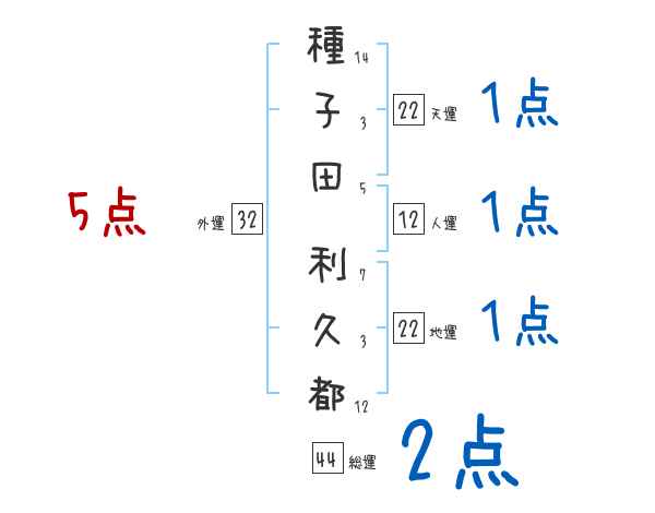 外運![]() | 種子田利久都さんの外運は32画の5つ星!柔軟性があり成功する。チャンスが多く金運が良い。 生活面を象徴する運勢です。外部から受ける影響力を表し、結婚運、家庭運や職場、環境への順応性を表します。 |