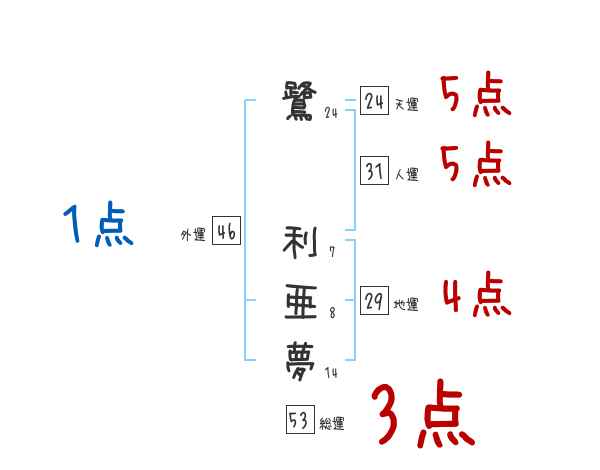 総運![]() | 鷺利亜夢さんの総運は53画の3つ星!やや見栄っ張りで虚栄心がある。散財に注意。 あなたの人生を表す1番重要な運勢です。生涯を通じて影響する総合運となり、主に50歳以降の晩年期に影響を及ぼします。 |