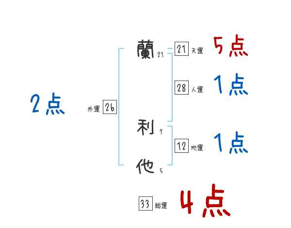 外運![]() | 蘭利他さんの外運は26画の2つ星!波瀾万丈かも。信頼できる人を大事にしましょう。 生活面を象徴する運勢です。外部から受ける影響力を表し、結婚運、家庭運や職場、環境への順応性を表します。 |
