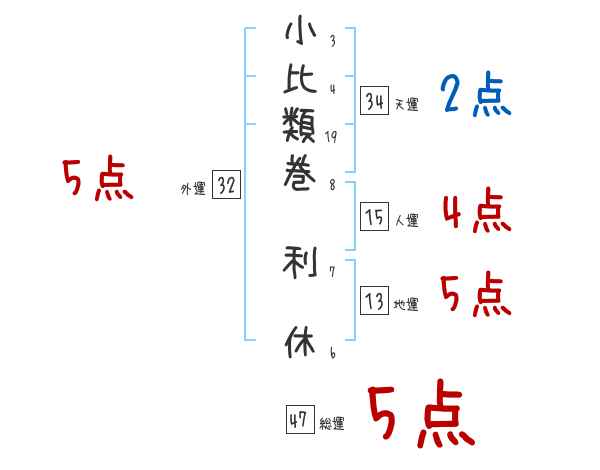 外運![]() | 小比類巻利休さんの外運は32画の5つ星!柔軟性があり成功する。チャンスが多く金運が良い。 生活面を象徴する運勢です。外部から受ける影響力を表し、結婚運、家庭運や職場、環境への順応性を表します。 |